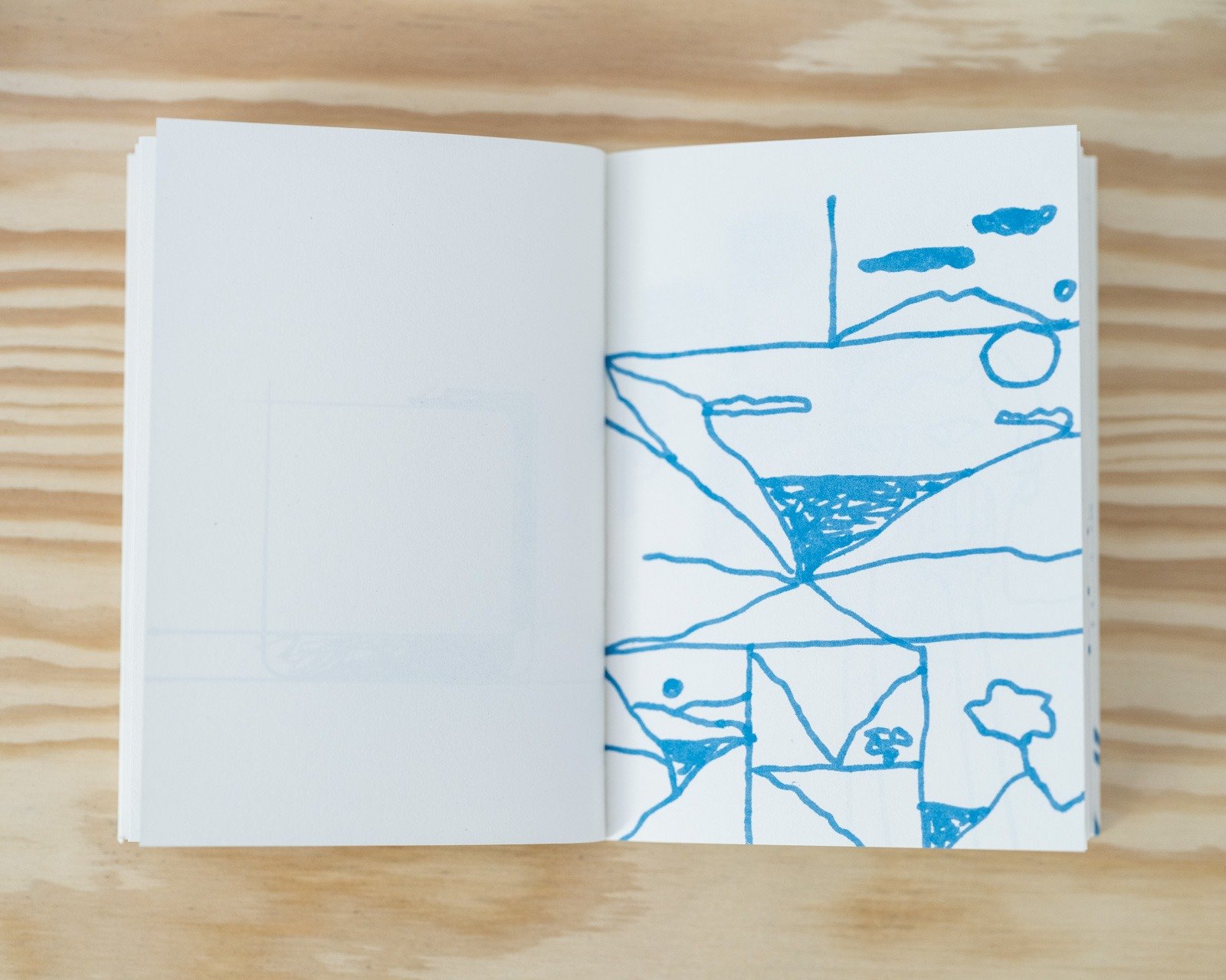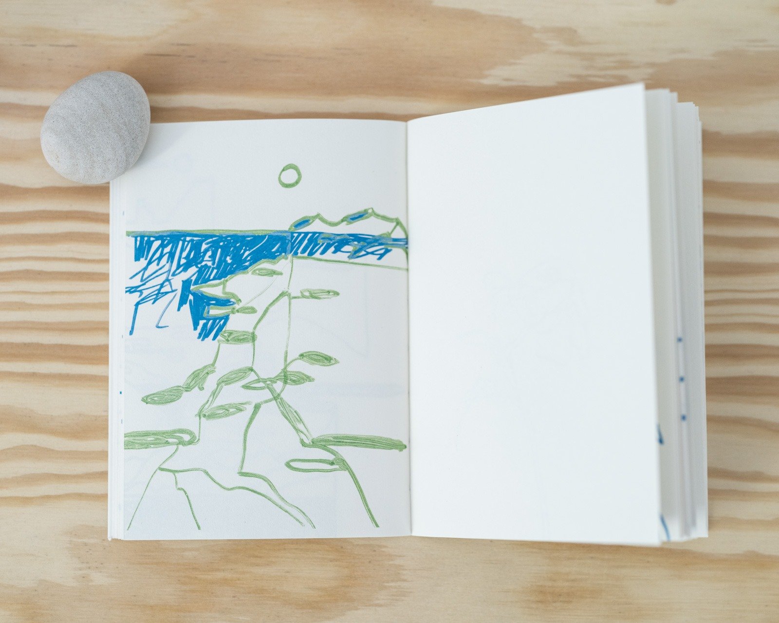 Filling frames, he drew what he saw. Flashes of sea between nubby hills. A sun-shaped sun. Flora feeling just fine. He drew things he couldn’t have seen, mirages of a delirious island. An underwater tango.