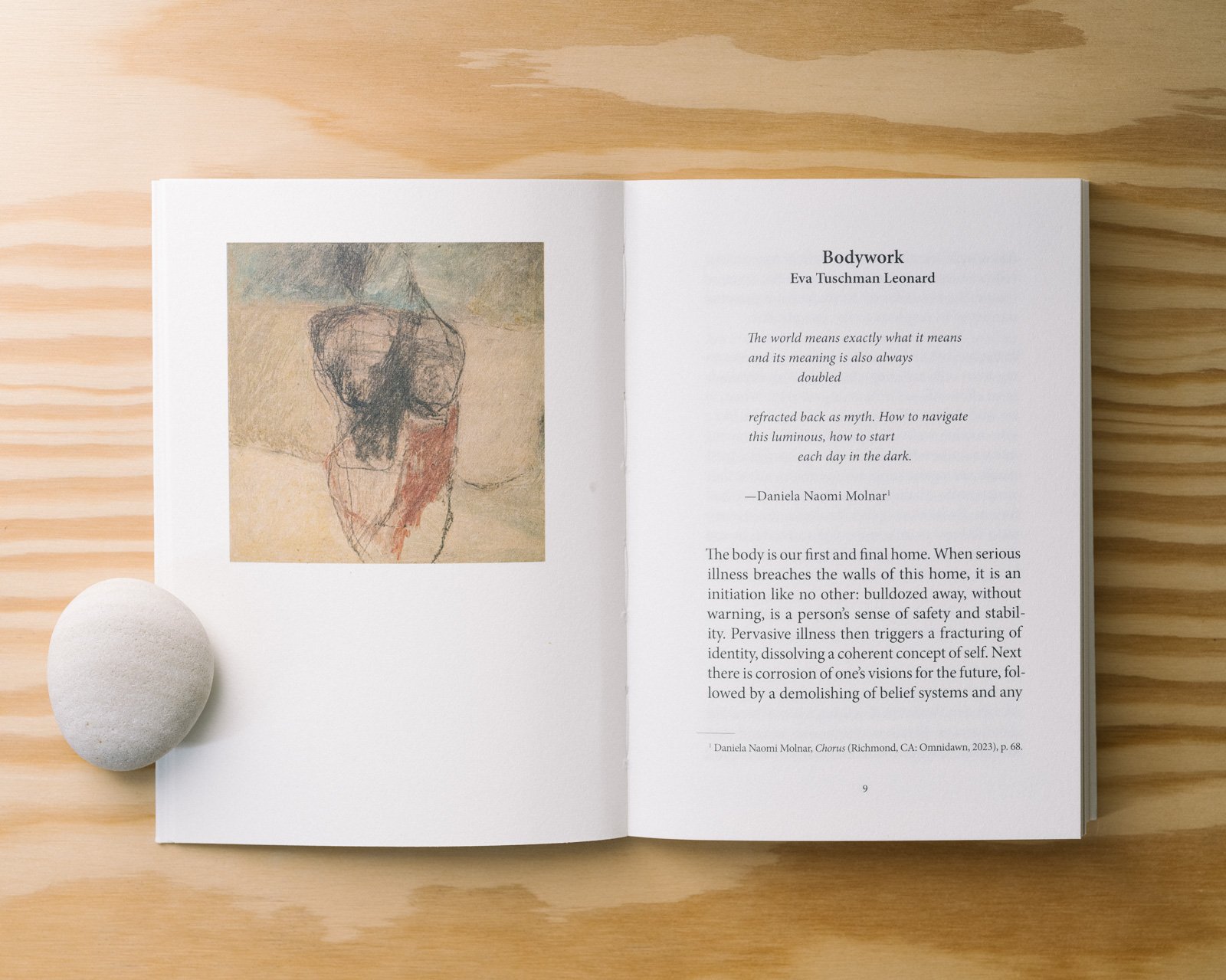 In Bodywork, the writer, visual artist, and psychotherapist Eva Tuschman Leonard situates herself, through word and image, in two states of being two decades apart: as a physically expressive and active body in its twenties; and as one later subjected to the debilitations of autoimmune disease, requiring the daily labor—the titular Bodywork—of pain management.