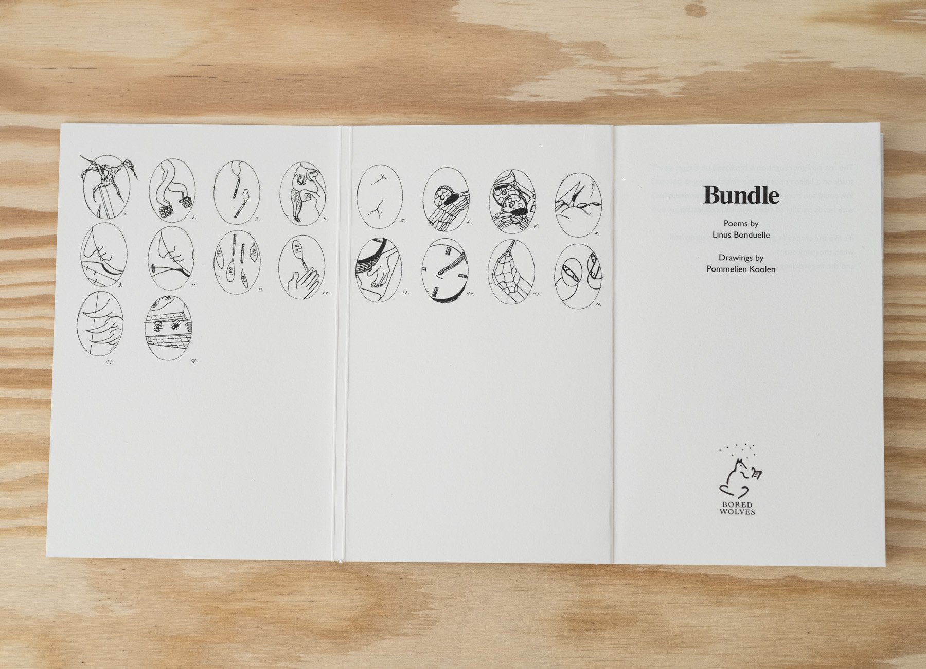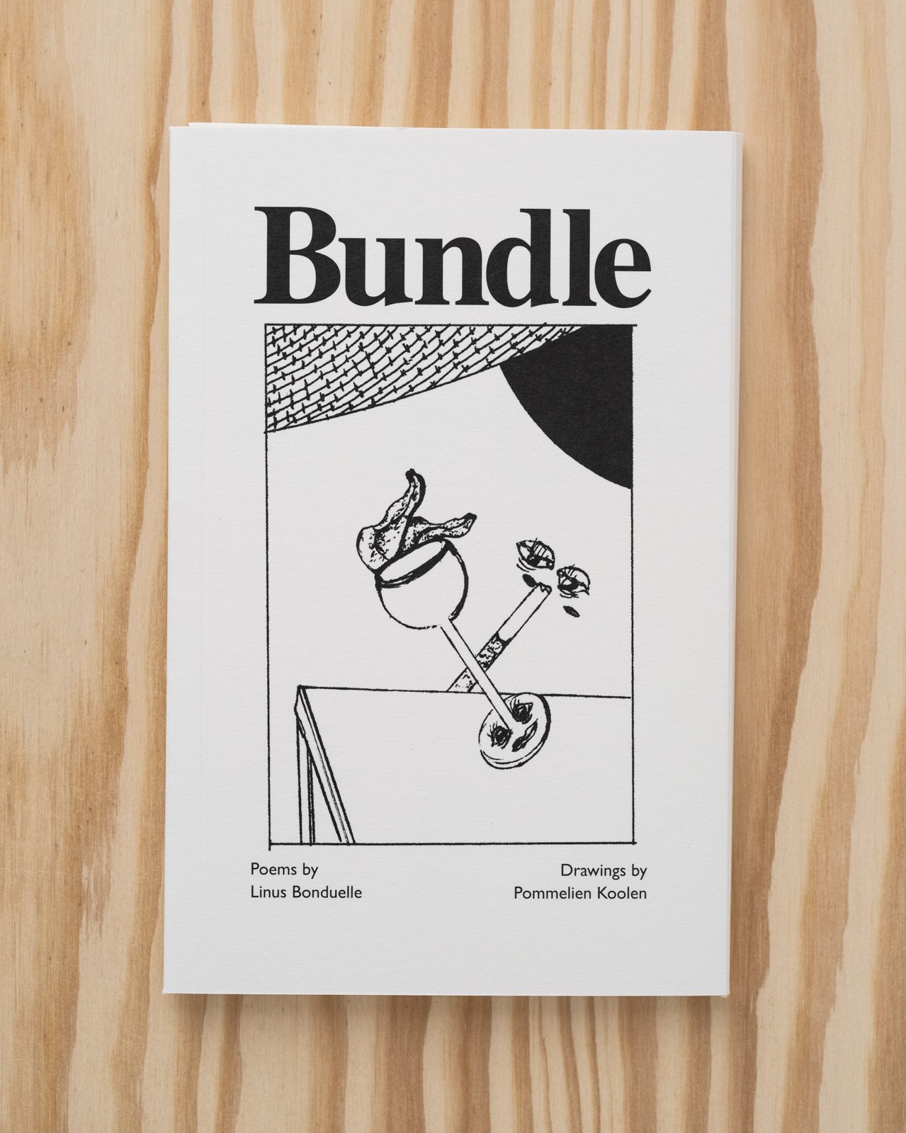 Bundle is a collection of poems for a scrambled era written by Linus Bonduelle, who, during the early pandemic period, punched his pillow with poetry every evening and felt better for it. The collection is illustrated with offbeat precision by artist Pommelien Koolen, and cleverly designed by Linus and Pom with a snug wrap-around flap in the tradition of important bureaucratic mail that you normally open with trepidation but here with glad curiosity.