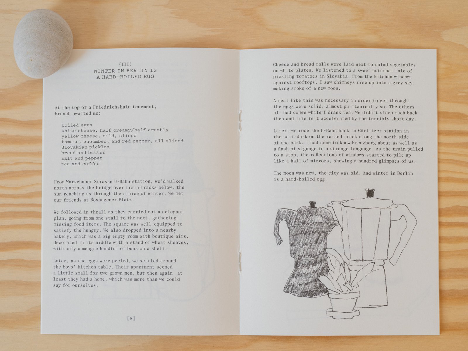 Zine of Alex Rossiter’s pencil drawings of the eponymous vessels combined with prose journaling and resourceful recipes bound up in Alex’s memory with periods in his life when in various countries he has been a postman, a cook, a baker, and, wherever he’s been, an artist and a poet.