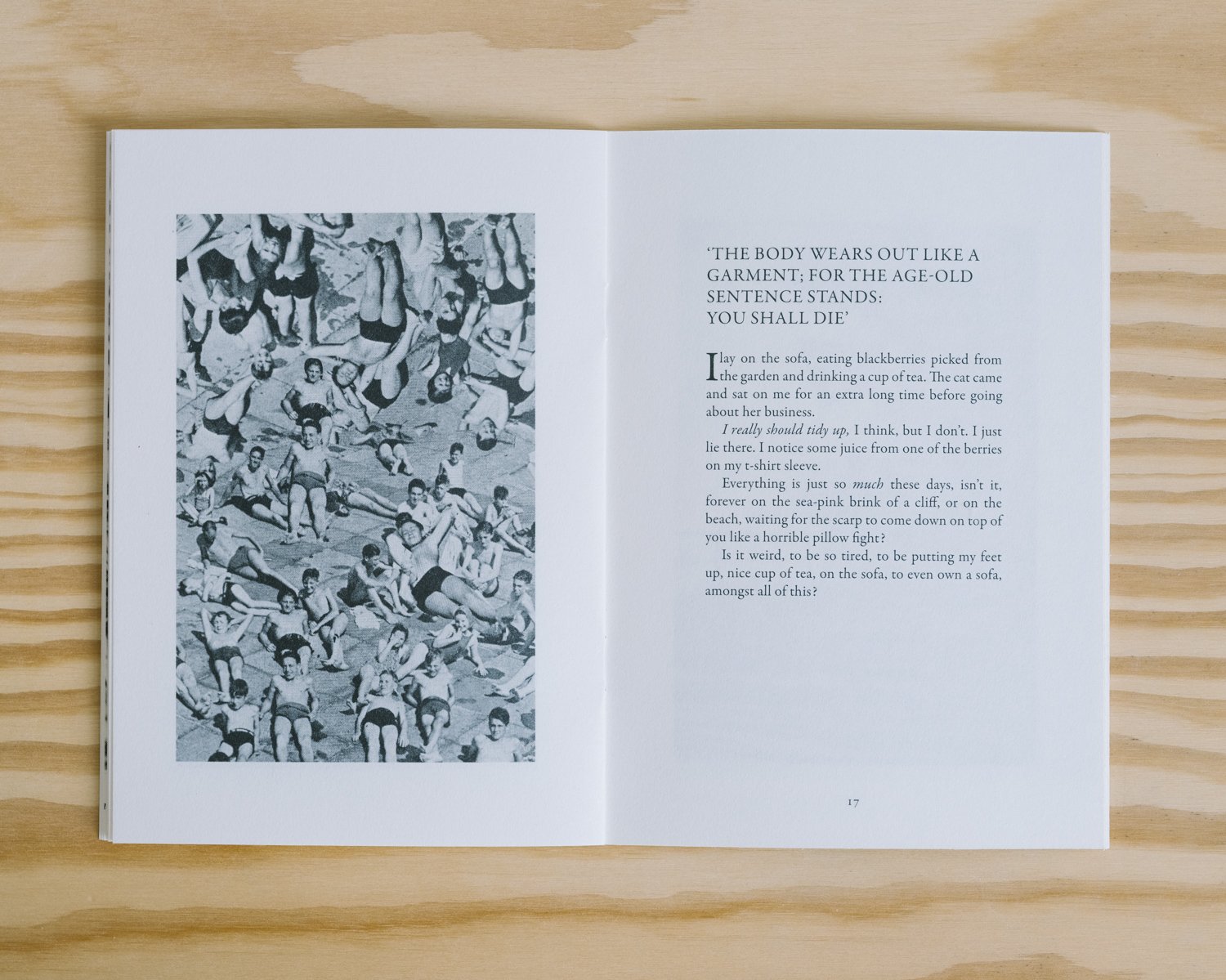 Pocket-sized, 28-page zine of poetry and collage by Bristol author and comix artist Simon Moreton (Now Is the Time to Know Everything, Minor Leagues). Tenderly fatalistic collection of diurnal observations; snippets of days unfolding “forever on the sea-pink brink of a cliff, or on the beach, waiting for the scarp to come down on top of you like a horrible pillow fight.”