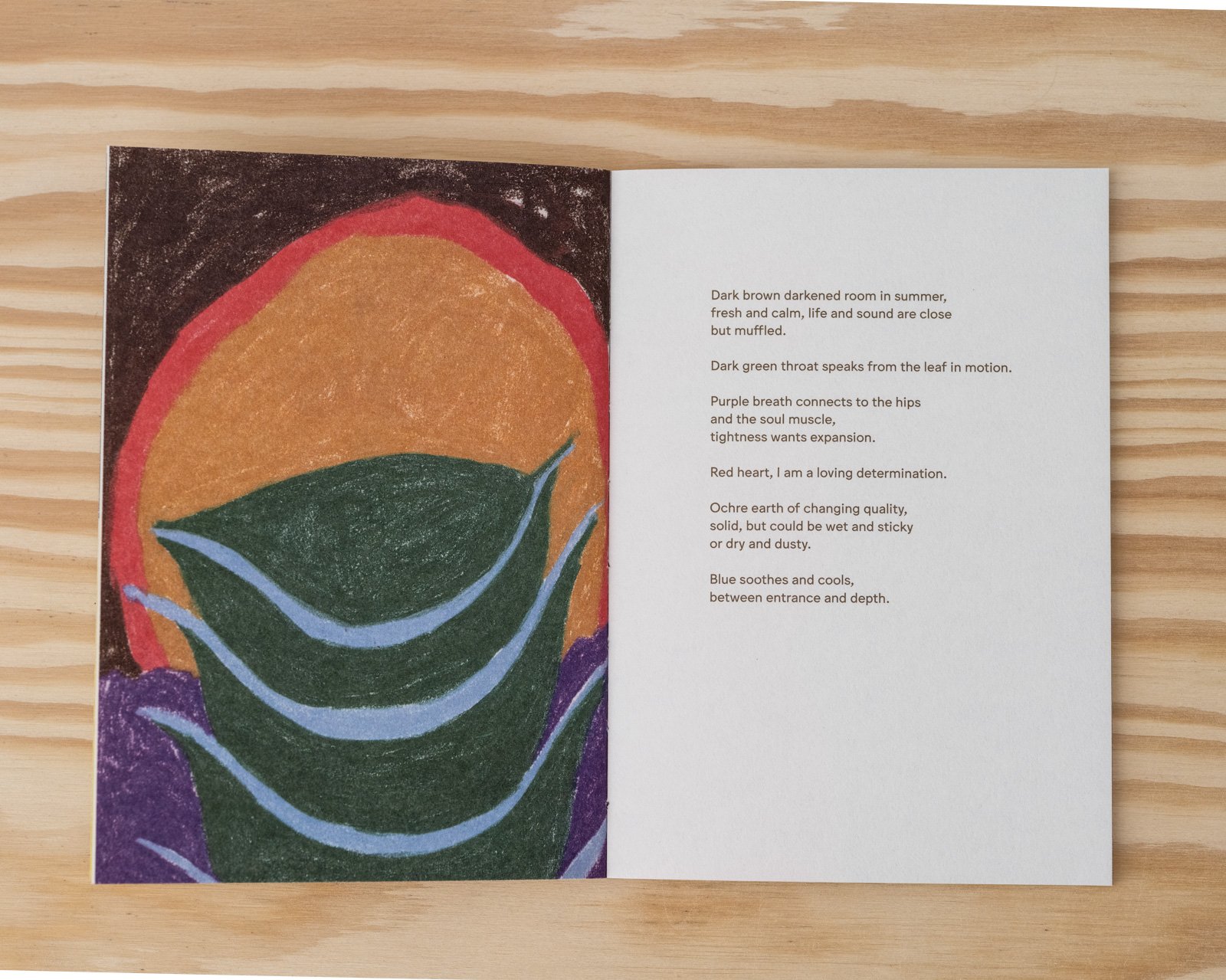 Dark green throat speaks from the leaf in motion. / Purple breath connects to the hips / and the soul muscle, / tightness wants expansion. / Red heart, I am a loving determination.