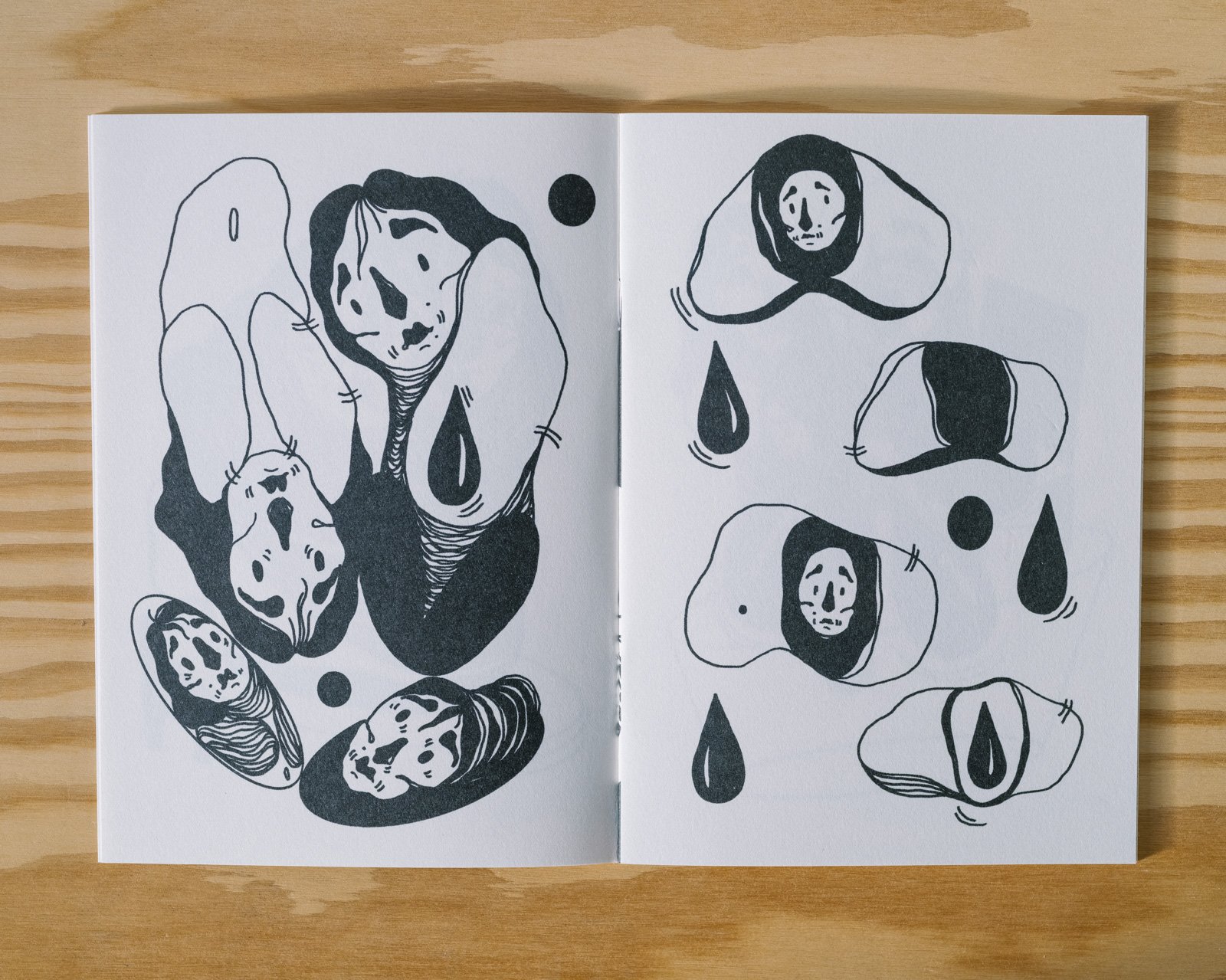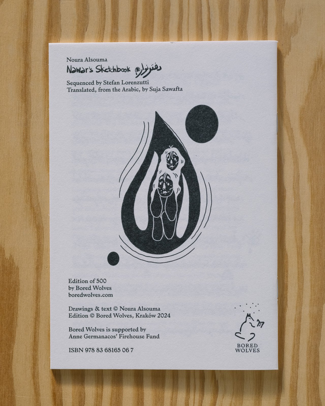 Noura Alsouma’s zine “Nawar’s Sketchbook” is a liquid lament by the Berlin-based Syrian visual artist and printmaker, riveted to eyes that see and therefore shed tears, channeling the heartfelt exposure of the sketchbooks Noura fills to the bleed.