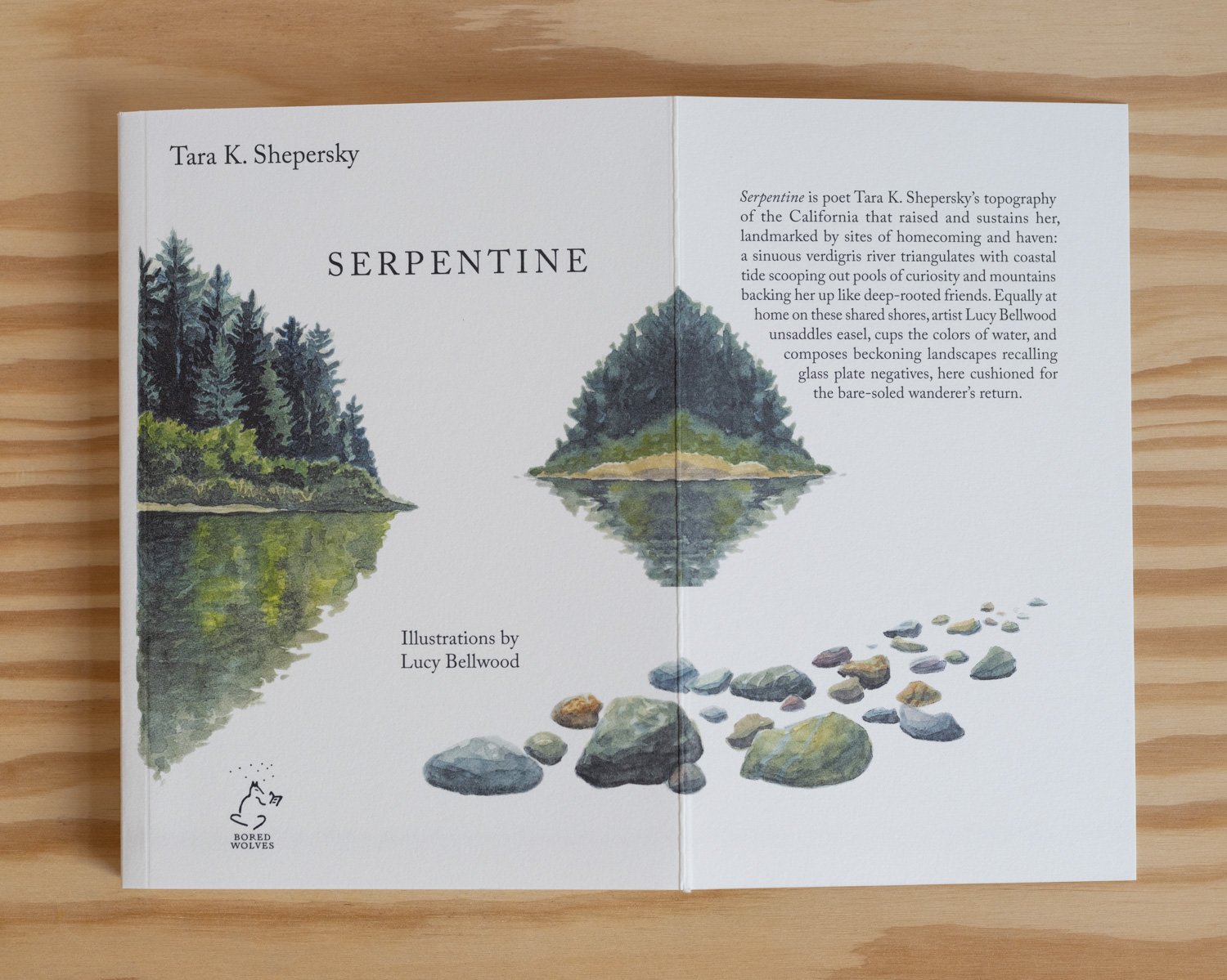 Serpentine is poet Tara K. Shepersky’s topography of the California that raised and sustains her, landmarked by sites of homecoming and haven: a sinuous verdigris river triangulates with coastal tide scooping out pools of curiosity and mountains backing her up like deep-rooted friends. Equally at home on these shared shores, artist Lucy Bellwood unsaddles easel, cups the colors of water, and composes beckoning landscapes recalling glass plate negatives, here cushioned for the bare-soled wanderer’s return.