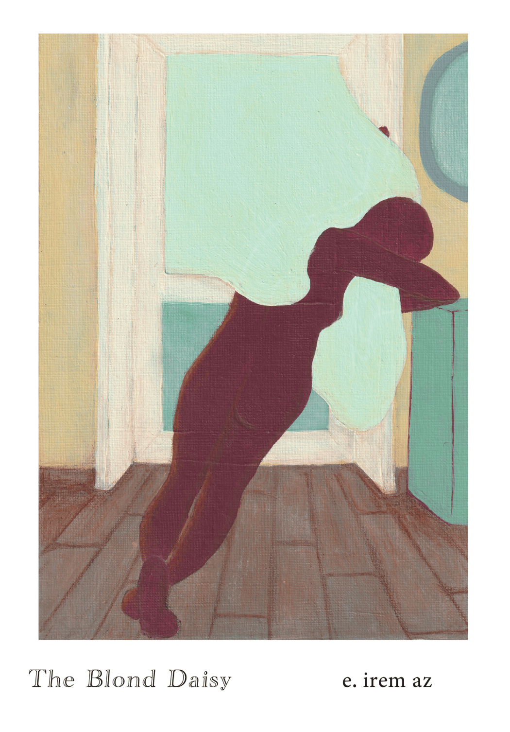 e. irem az’ The Blond Daisy is a booklet composed of two multi-section poems, including the eponymous poem, about irem’s late grandmother, Zinet Tosun, and her Allah, at once universally boundless and simultaneously present in diurnal labor; and “perhaps it all started with,” which resurfaces smothering intergenerational trauma, zeroing in on domestic thresholds as simultaneously a seal but also potential escape route.