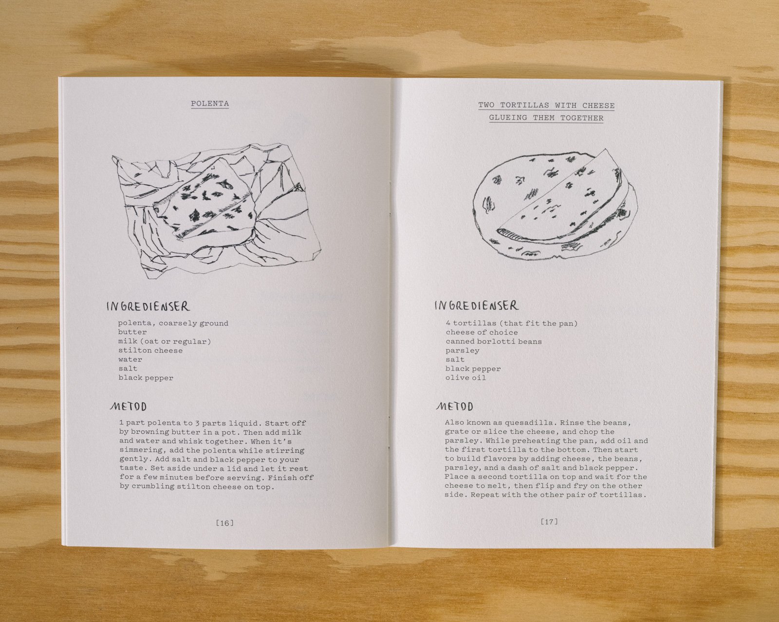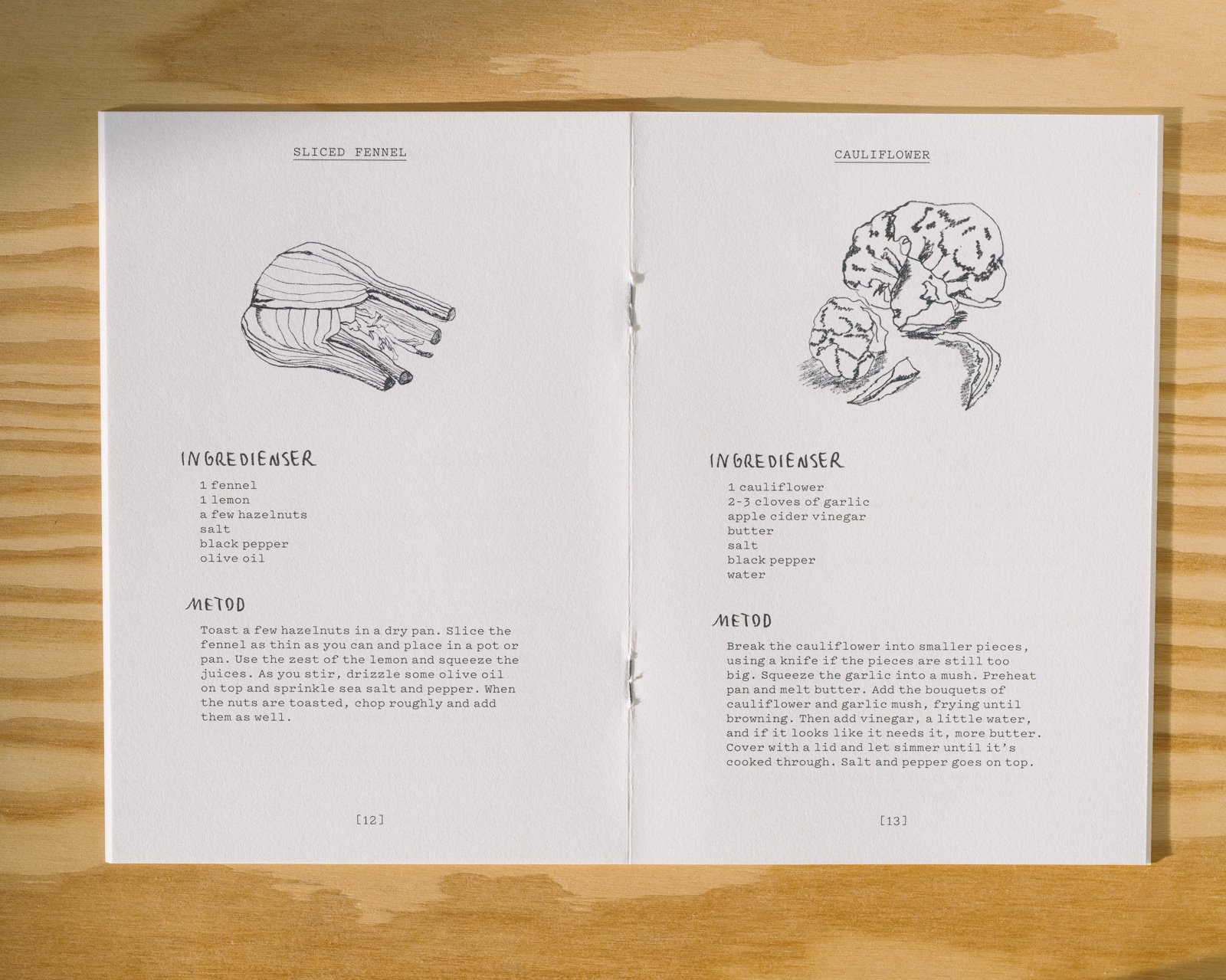 Artist Felix Dahlström Persson’s Thermos zine is a collection of pencil drawings and tasty trail-tested recipes that you can smoosh into your thermos before setting off on a hike, including instructions for campsite steamed cod on herbs, cheesy peppery polenta, Porro e Pepe, fennel with hazelnuts, appearances of lascivious leek and surprisingly coquettish cauliflower, halloumi with cornichons, ajvar & co., flapjacks, pizza in parts, and the ambrosial Thermos Spritz. And all related in Felix’s mellow voice: “Start by boiling pasta like you used to do,” and, with generosity, “if it looks like it needs it, add more butter.”