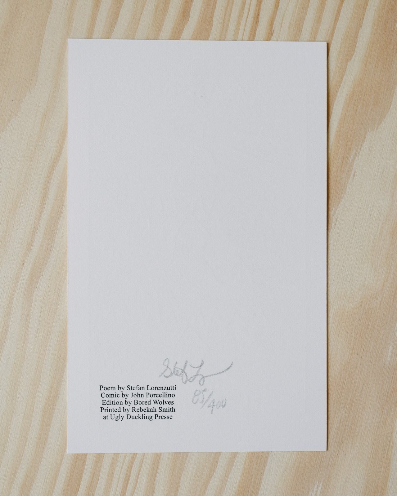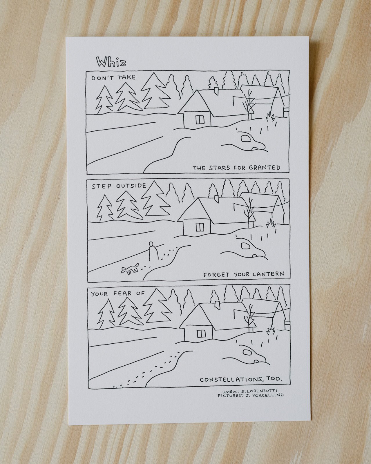 Letterpress print of Whiz, a three-panel adaptation by legendary comix artist John Porcellino (King-Cat, Thoreau at Walden, South Beloit Journal) of a pup-companioned Stefan Lorenzutti poem about trying to remain existentially grounded while whizzing against a barn beneath the fathomless vault of the night sky: